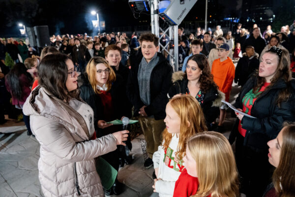The night formally ended with a gathering outside of the FCAA. The small ceremony involved lighting the Christmas tree, prayer, and some more carols by the chorus. The FCAA’s snow machines were brought out and activated, but ended up becoming unnecessary because, yes, it actually began to snow!