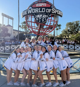 article by Mallory Renz ’29 After tirelessly working on their routines for six months, fifteen determined Kellenberg Cheerleaders traveled to Orlando, Florida to take the mat at the Universal Cheerleaders Association National Invitational competition. The Firebirds did not disappoint, advancing to the national semifinals among a field of over
